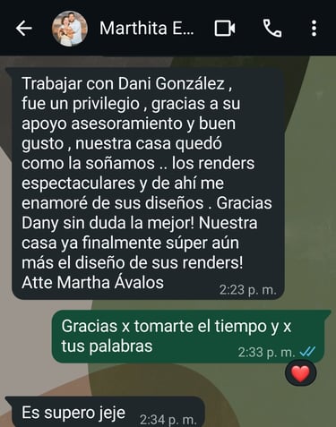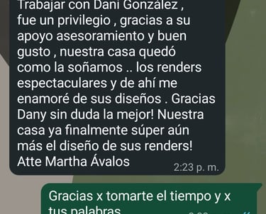 Working with Dani González was a privilege. Thanks to her assesment and good taste our house was finally as we dreamt it. The renders were spectacular, and thats where I fell in love with her designs. Thank you Dany, definitely the best! Our home finally was better than the render design.